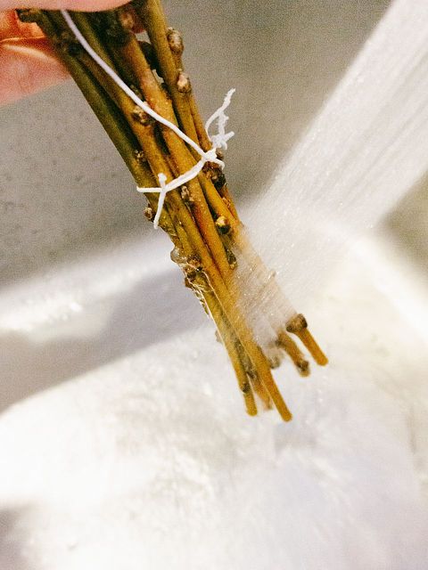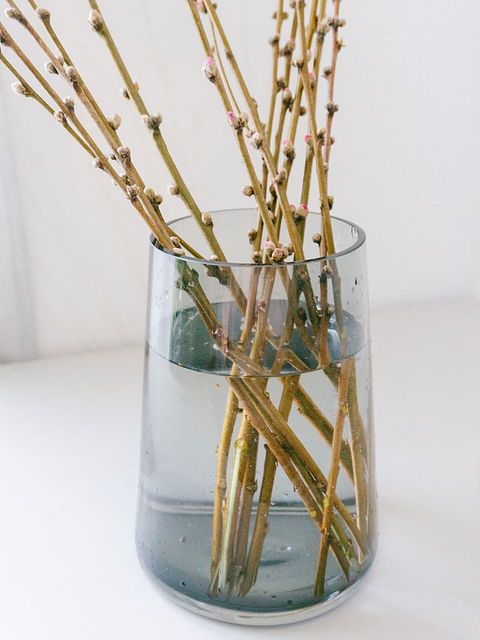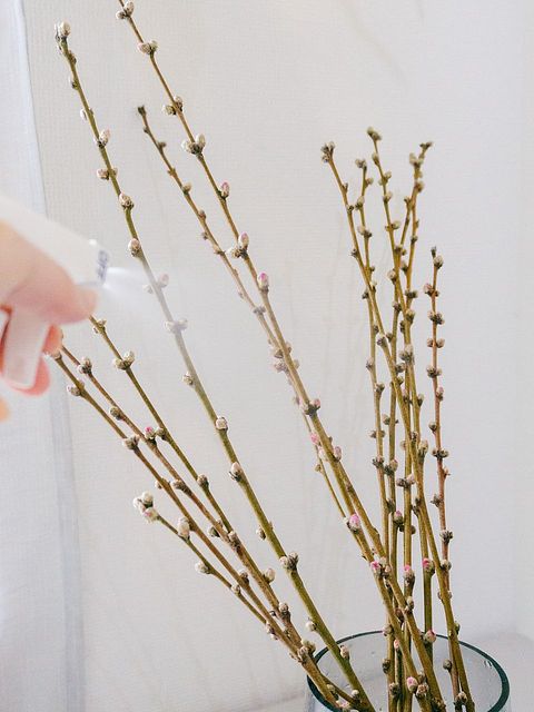 3.たっぷりの水(枝の1/3が浸かる程度)に浸け、2〜3時間ほどしっかり水揚げを。水に浸かる部分についている蕾は思い切って取り除きましょう。
