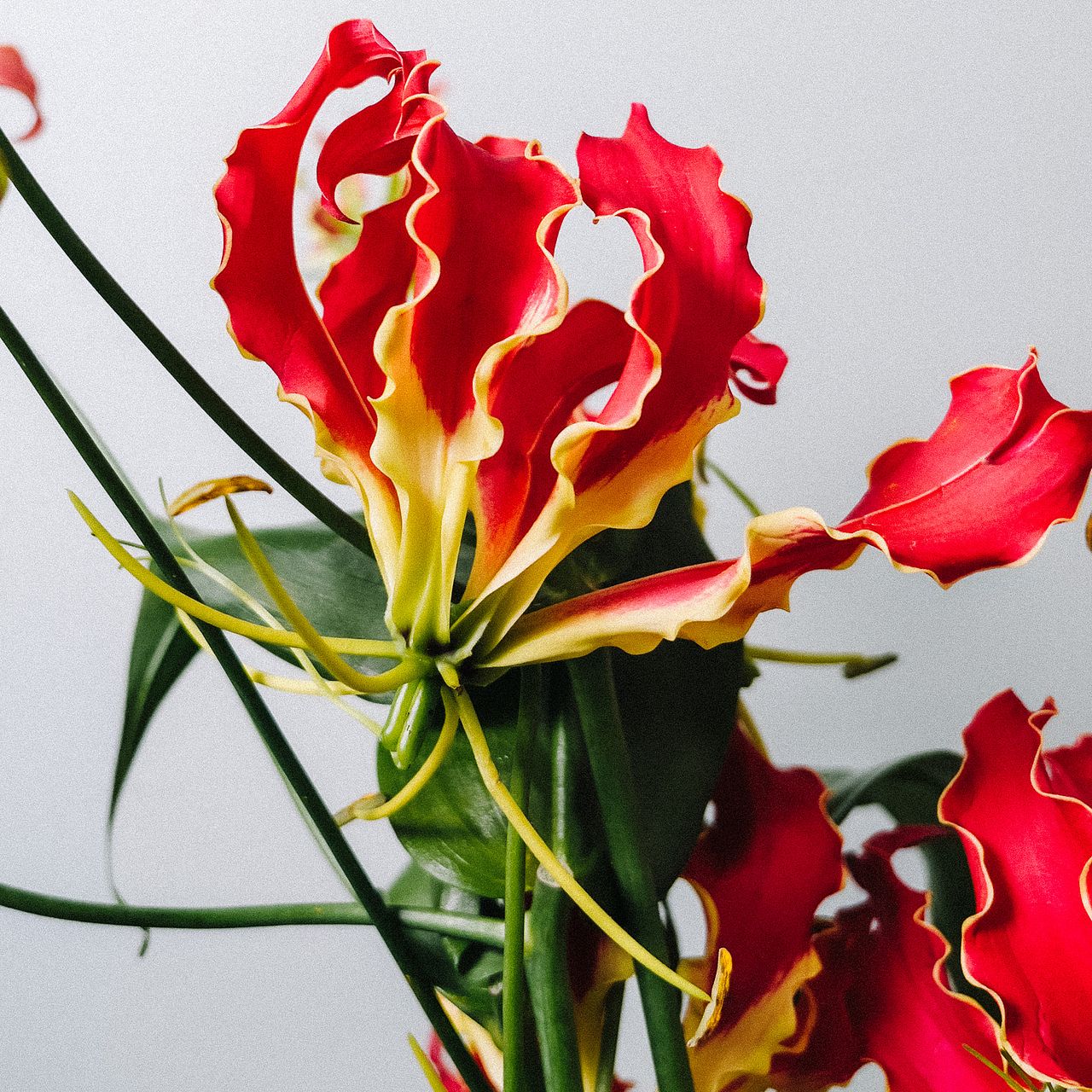 燃え盛るように花を咲かせるグロリオサ。ラテン語の「栄光」が名前の由来だとか。動きのあるお花なのでラフに飾るとおしゃれに👌5本お届けします。