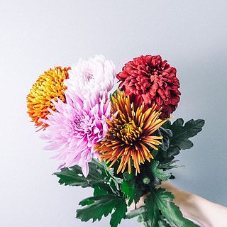 お供えのイメージが強いマムですが、スパイダー咲きやポンポン咲きなど、さまざまな咲き方や色合いがあります。花保ちの良さはダントツ。長く楽しめるお花です。どんな品種が届くかは箱を開けるまでのお楽しみ。5本お届けします。