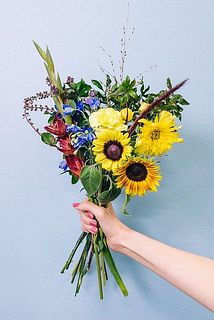 ひまわり / スプレーバラ / スターチス / ぺニセタム / デルフィニウム / アフリカンブルーバジル / あせび / グラジオラス / カーネーション / アゲラタム
