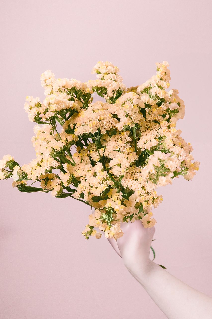 ワイルドなセルリアや小花がかわいいスターチスなどを束ねてボリュームたっぷりに。庭で摘んだようなラフな雰囲気が魅力🌿
