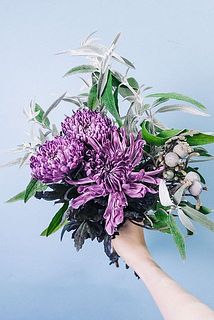 パープルとシルバーグリーンのカラーリングがおしゃれ💅マム「マジェンダダーク」をメインにしたブーケ。