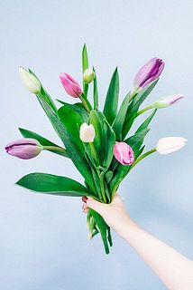 ホワイトチューリップの花言葉は「新しい恋」。ピンクチューリップの花言葉は「愛の芽生え」。紫チューリップの花言葉は「不滅の愛」。