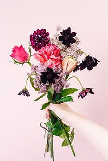 チューリップ / チョコレートコスモス / レースフラワー / スカビオサ / バラ / カーネーション