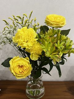 お正月のおまかせブーケがさすがにヘタってきたので、今回はこちらにしてみました。 ボリュームたっぷり、黄色で気分も上がります! 次はひな祭りのピンク系にしようと思っています。