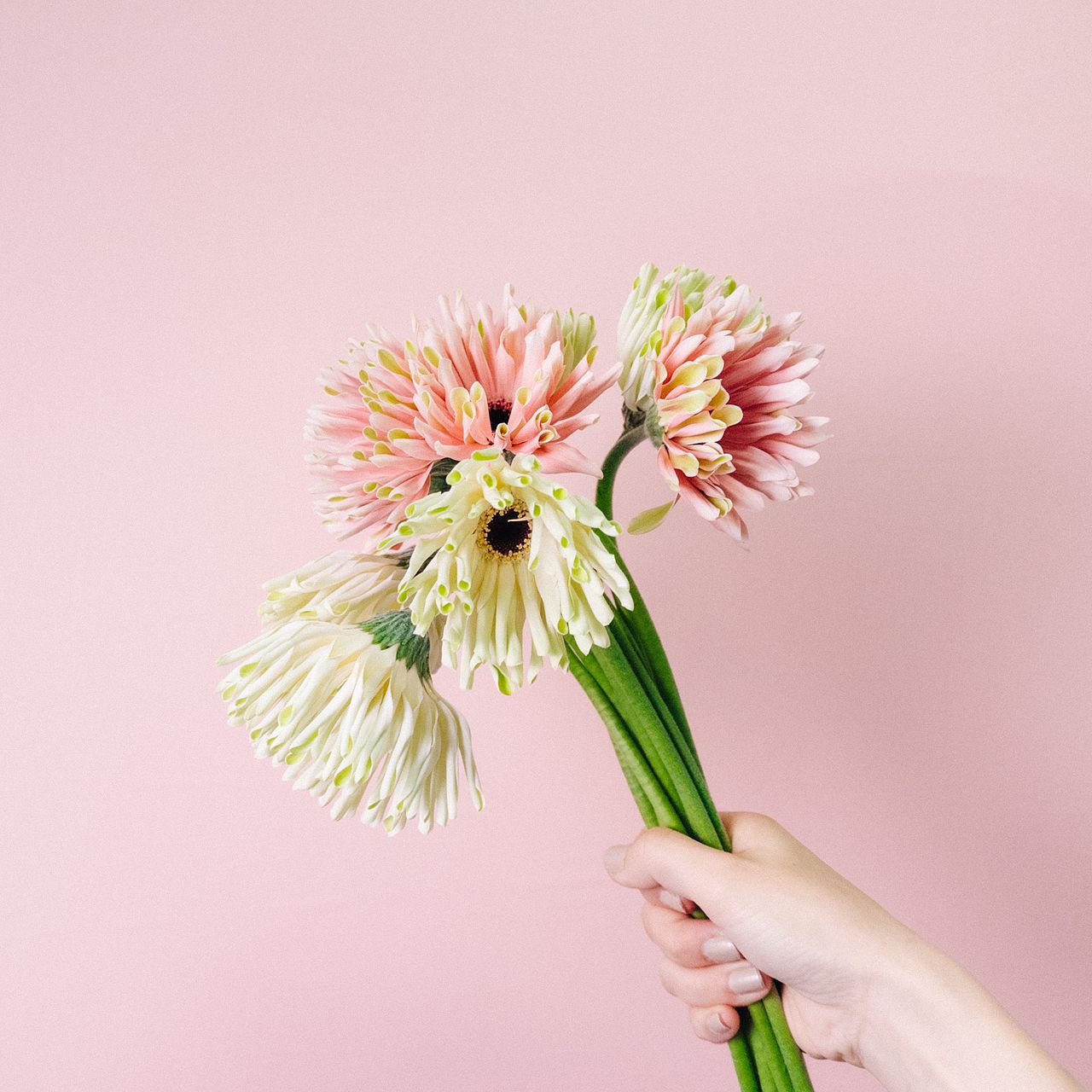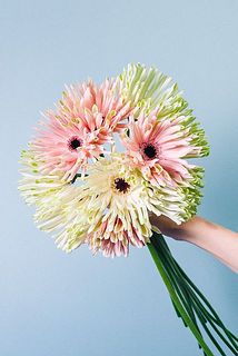 パスタ咲きのガーベラを束ねたブーケ💐くねくねとした花びらがかわいい😍珍しい品種なのでこの機会にぜひ。