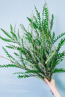 ノコギリのようにギザギザしている葉っぱがかわいい🌿ネイティブフラワーのグレビレア「アイバンホー」を束ねました。ドライな質感が特徴です。
