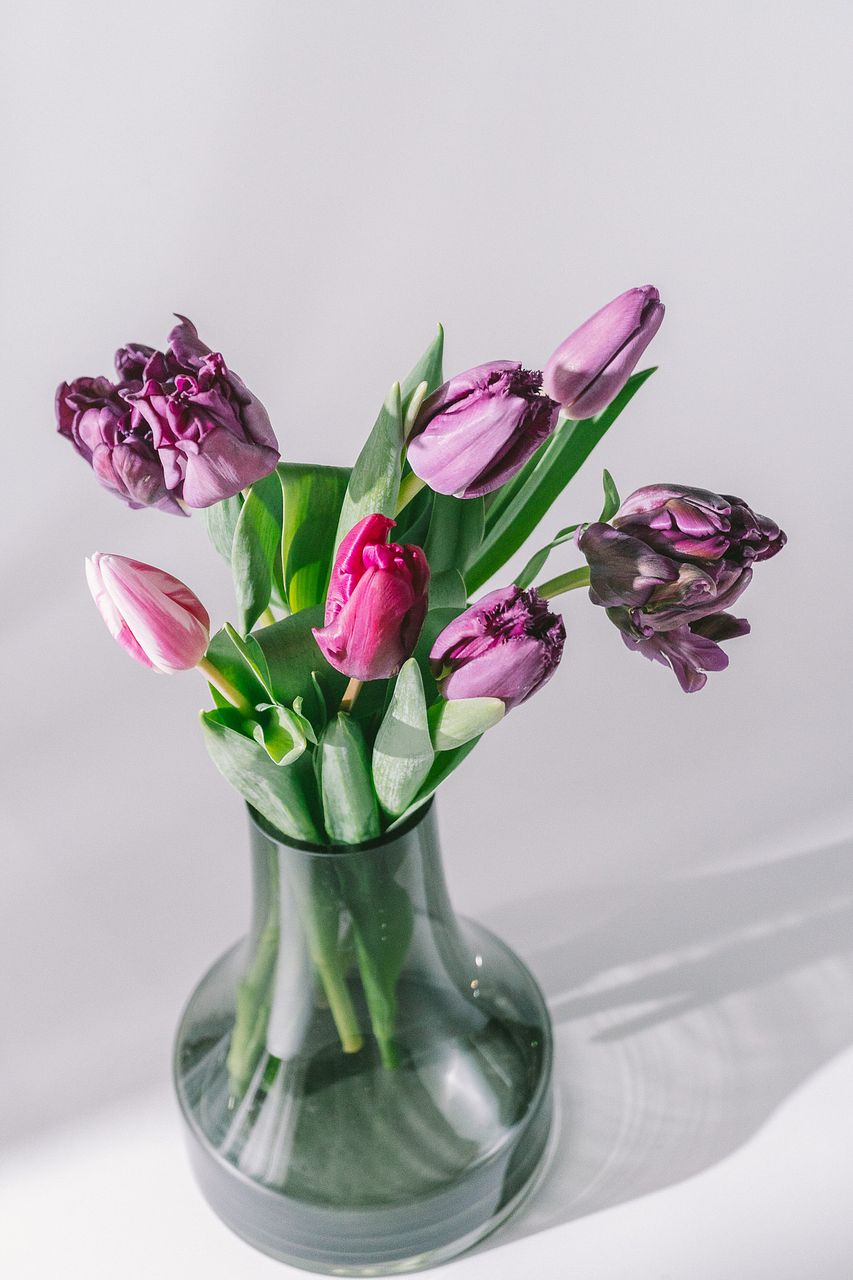 ぜひ大きめの花器に大胆に飾ってみて!あちこち自由に伸びるチューリップのかわいさが引き立ちます。[使用花器:Calore(ブラック)]