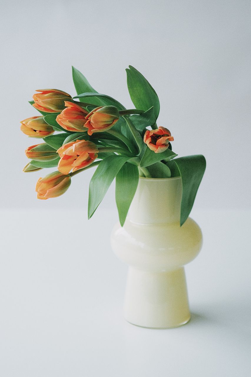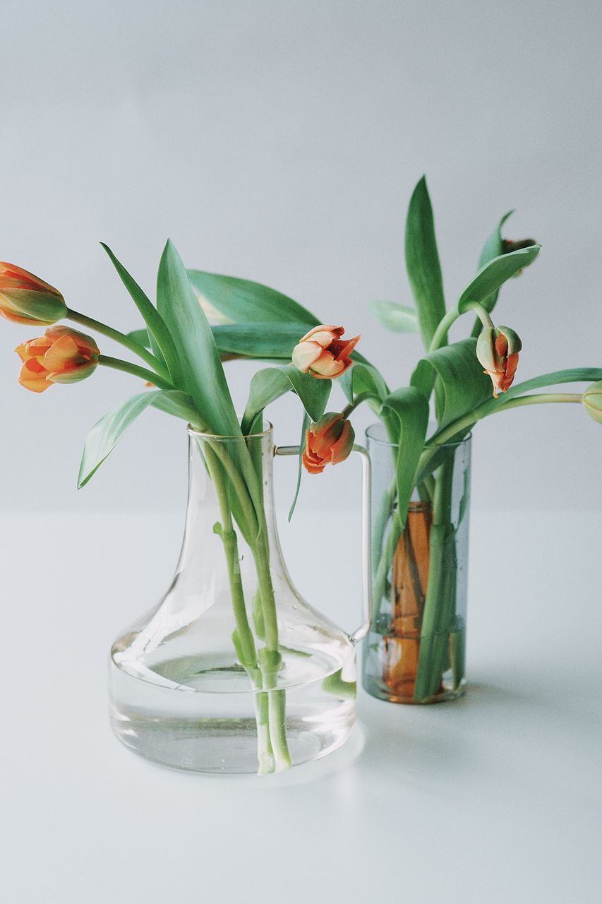 - 茎先を1センチほどカットし、深めの水(高さのある容器の8割くらいの水が目安)に2〜4時間水につけてあげましょう。葉っぱは思い切って間引いてください。お花屋さんになった気分でお手入れしてみてくださいね。