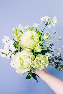 ややフリルがかった大輪のバラ「オートクチュール」をメインに、めずらしいホワイトカラーのデルフィニウムや、アルストロメリア「パール 」をそえて、ふんわりホワイトドレスなようなナチュラルカラー🕊️🌿