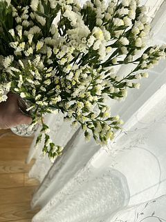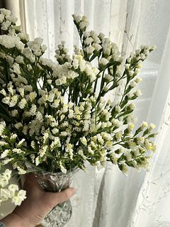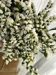 「もこもこホワイトスターチス」去年買ってとても良かったので二度目の購入です。 今回は「もこもこ」まではいってなく開花途中だったり蕾が多い感じで少し残念です。 ドライフラワーにしてリースの花材にしたいのでこれから「もこもこ」になってくれるといいのですが…