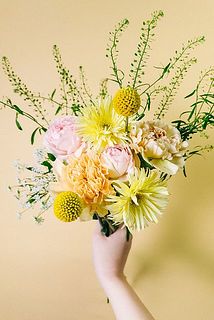 まん丸のお月様のような「ゴールドスティック」とガーベラ「ムーンライト」を主役に束ねました🌕
