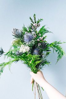 メタリックな質感のエリンジウムエリンジウム、ごろごろつぶつぶのシルバーブルニア、ライスフラワーなど初夏の爽やかな情景をイメージして旬な草花を合わせました🌿