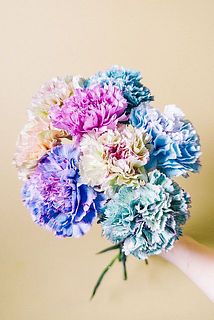 アイスクリームのようなマーブル模様がたまらなくかわいい🍨ブルーの染めのカーネーションとピンク、ベージュのカーネーションのポップなブーケ🫧