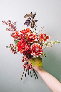 デコラ咲きのダリア「福寿」をたっぷりと!ダリアの中でも比較的持ちのよい品種です。染め雪柳を組み合わせて秋の紅葉をイメージ🍁