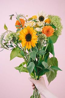 紫陽花アナベル / ひまわり / スプレーバラ / ガーベラ / ベロニカ / 紅花 / ユーカリ / ケイトウ