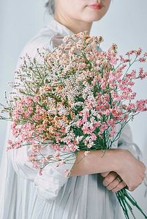 今の時期のおすすめはハイブリッドスターチス。つぶ感のある八重咲き、繊細な一重咲きをたっぷり束ねると、まるでふわふわの綿菓子のよう。ひとつひとつ咲き方が異なるので、ぜひ近くでじっくり観察してみて。