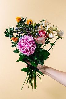 ピンク色の芍薬やバラをメインに紅花、アガパンサスなど季節のお花を束ねて。