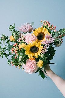 マム / 紅花 / カーネーション / ユーカリ / ヒペリカム / ヒマワリ