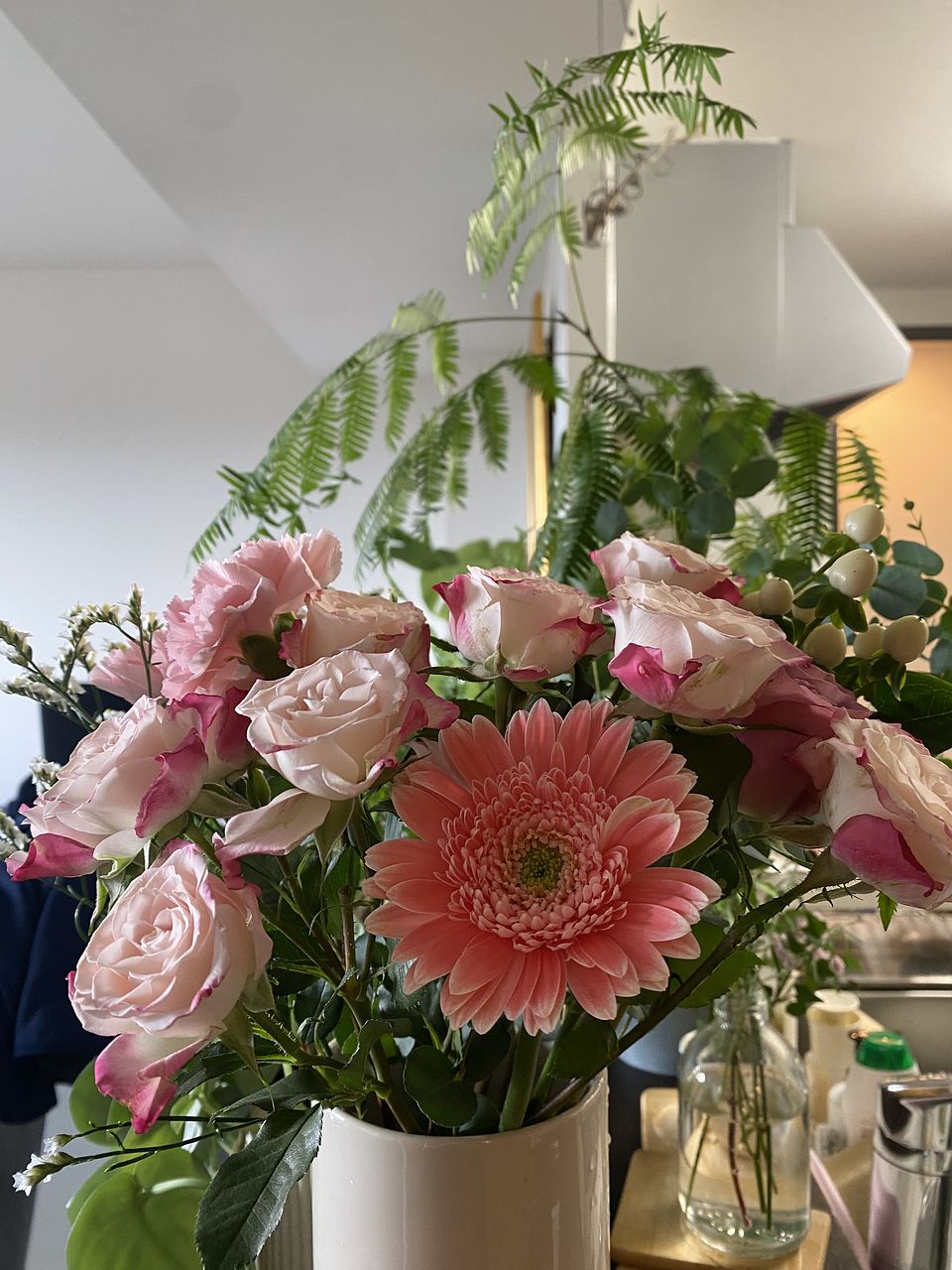 今回はてんびん座のシンボルカラー、ピンクを束ねて♎️淡いピンクのバラや、つんつんのスパイダー咲きガーベラをセレクトしました。