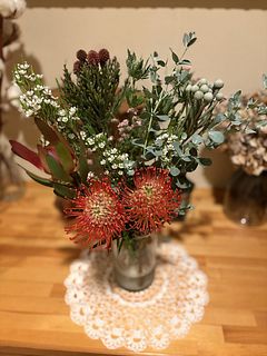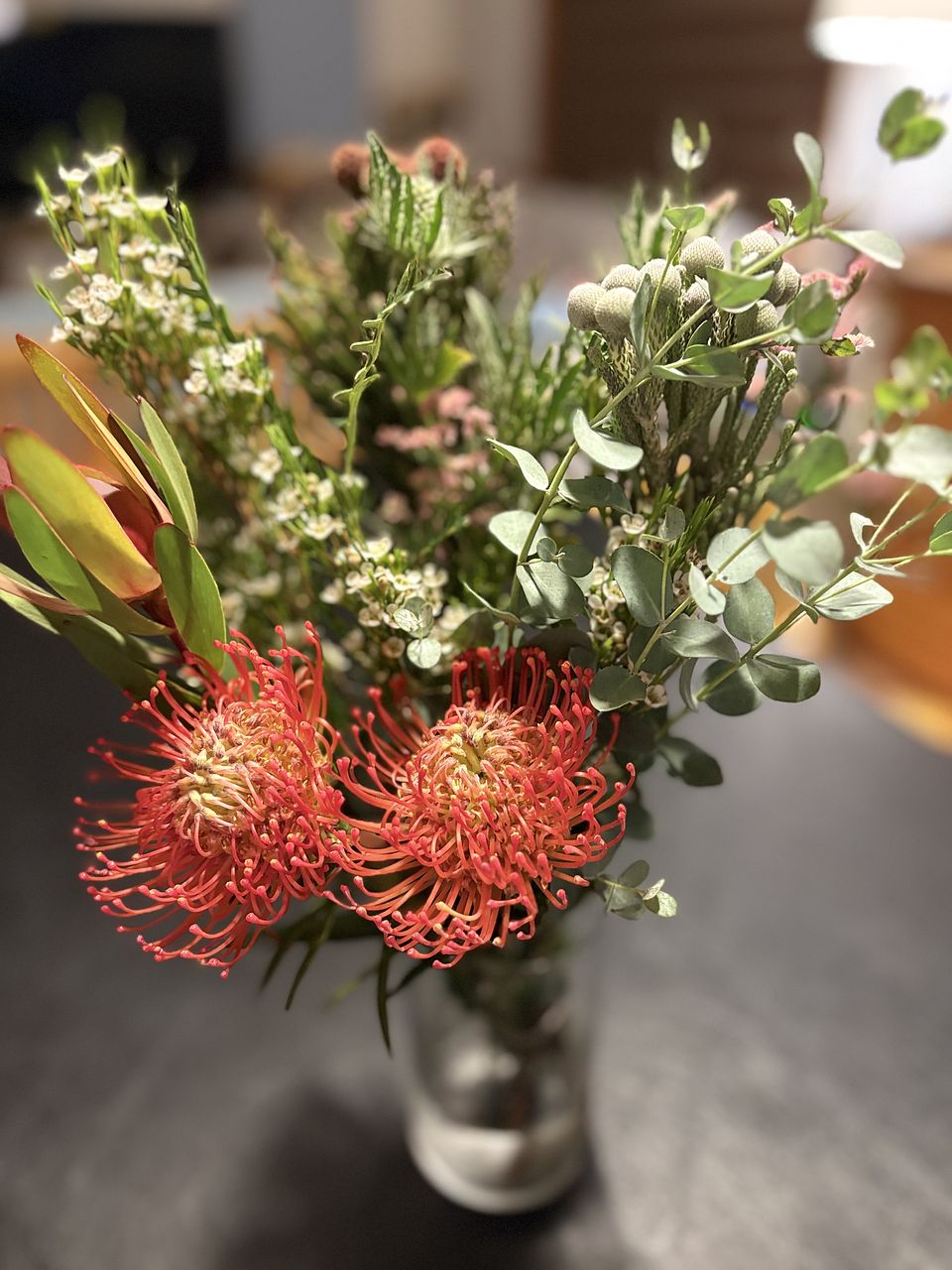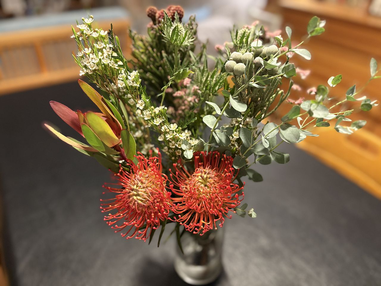 秋はネイティブフラワーの種類が豊富!ピンクッションやリューカデンドロンなどたっぷり組みあせました。花瓶のお水は少なめでOK。ドライフラワーにもぴったり。