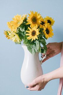 ぽってりと丸みのあるフォルムは、どこかアンティークのピッチャーのよう。白にひまわりがよく映えます。