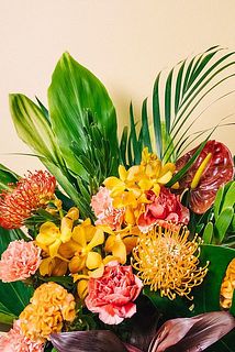 南国のお花を集めたトロピカルブーケ。オレンジや赤などを組み合わせて。どんなお花が届くかは、箱を開けるまでのお楽しみ。