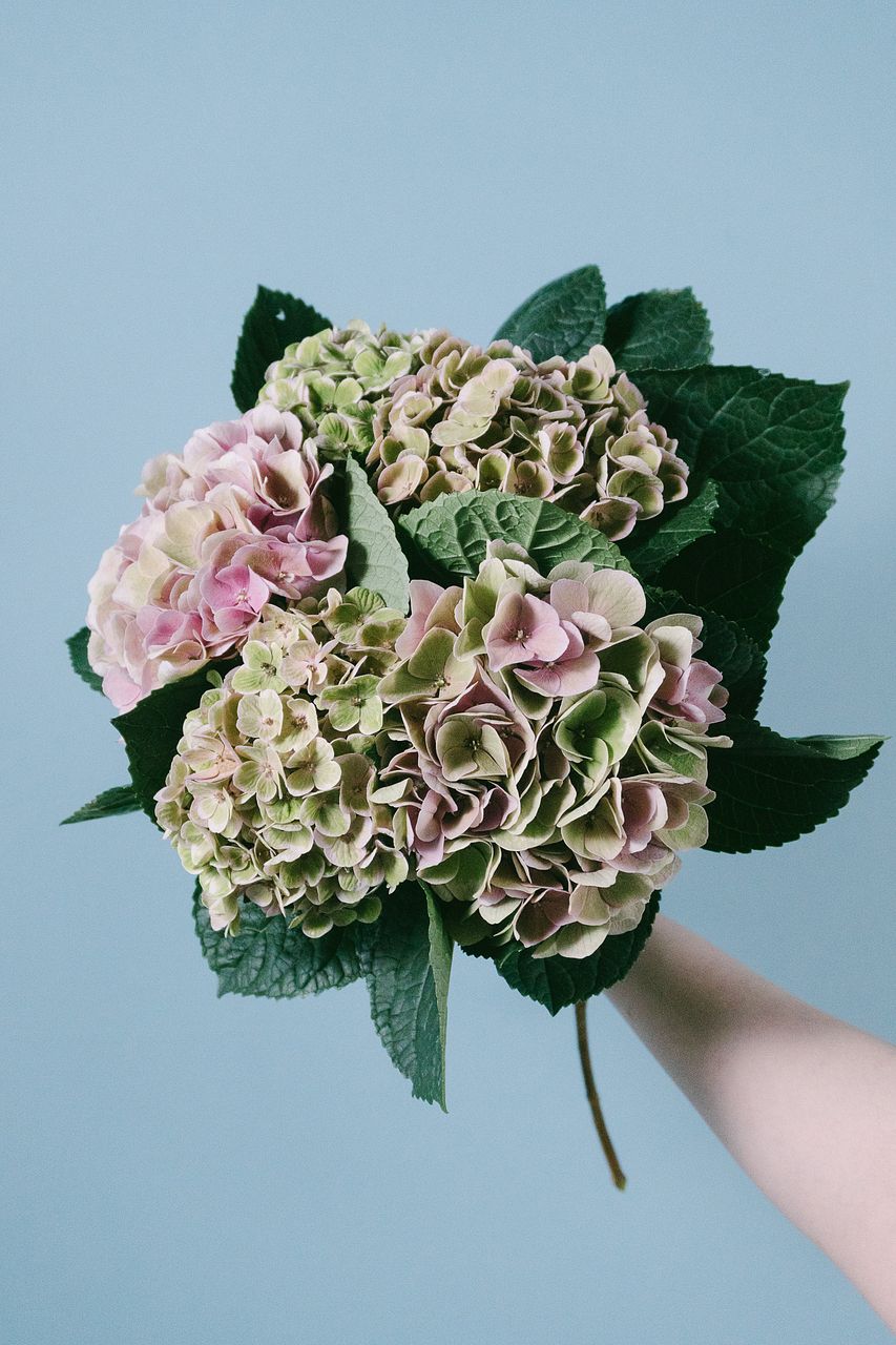 - お花がくたっとしている場合は、紫陽花を丸ごと水につけてみて。洗面台のボウルにたっぷり水を貯めて、紫陽花を浮かべるだけ。ガクや葉っぱから水を吸う特性があるので、数時間後にはしゃきっとします。お花屋さんになった気分でお手入れしてみてください。
