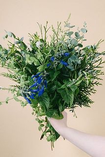 アップルミント、オーデコロンミント、メドーセージ、ニオイヒバ、ユーカリをたっぷりと束ねて🌿