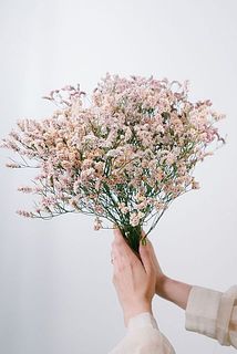 今の時期のおすすめはハイブリッドスターチス。つぶ感のある八重咲き、繊細な一重咲きをたっぷり束ねると、まるでふわふわの綿菓子のよう。ひとつひとつ咲き方が異なるので、ぜひ近くでじっくり観察してみて。