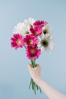 白い花びらに中心の黒い芯がキュートなガーベラ「スヌーピー」とピンク色がクセになる「ピーターパン」を束ねて。
