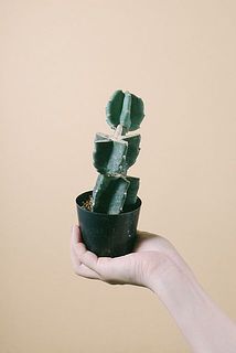 「鬼面角」と呼ばれる柱サボテンの仲間です。サボテンは通常どんどん真上に伸びていきますが、胴体の部分を水平に切ることで、枝分かれしたようなユニークな形へと育っていきます。このように仕立てられた形は「ブランチ」と呼ばれていて、さらに「胴切り」を繰り返すことで自分好みの鬼面角に仕立てることもできちゃいます!