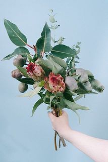 ユニークなユーカリ「ベルガムナッツ」と赤とクリームのグラデーションがおしゃれなプロテア「ロビン」を束ねて👒
