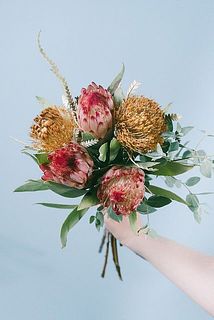 プロテア「ロビン」とくすんだオレンジゴールドの色がおしゃれなドライアンドラ「フォルモーサ」を束ねて。