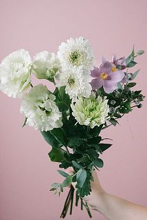 白いガーベラや淡いグリーンのトルコキキョウ、マムなど優しい雰囲気に束ねました。
