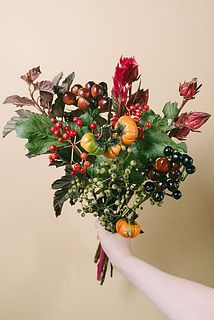 秋の実物をたっぷり集めました🍁🎃 かぼちゃのような「ソラナムパンプキン」と赤い実がうつくしい「ベニアオイ」、「ビバーナムコンパクタ」深い色合いのとうがらし「コニカルブラウン」など。様々なコロコロと丸い実たちの、可愛らしい姿を楽しんで。紅色の葉をしたテマリシモツケ「レディインレッド」もポイントです🍂