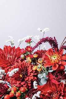 ゴージャスな赤色のお花を集めたおまかせブーケ。秋らしく華やかなおすすめカラーです🍁どんなお花が届くかは、箱を開けるまでのお楽しみ。