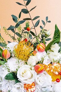 白とオレンジのお花をたっぷりと!どんなお花が届くかは、箱を開けるまでのお楽しみ。