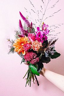北海道からアプリコットカラーのダリアが届きました。華やかなデコラ咲きは、ダリアの中でも比較的もちの良い品種をセレクト。夏の花と秋の花を大胆に組み合わせたFLOWERらしい花束に。