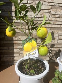 葉っぱは黄色みががっていて少し元気がないように見えるか、レモンが4つもついていた!!嬉しい!! 大切に育てて、また購入します☺️
