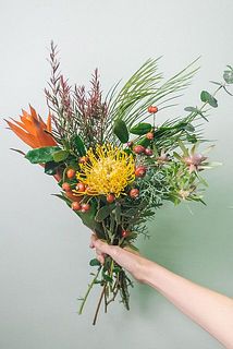 南アフリカのネイティブフラワーを中心にアメリカンホーリー(ヒイラギ)など赤い実ものがアクセント。