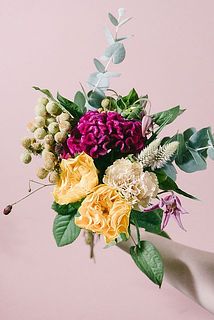 華やかな配色の秋の花を庭から集めてきたようなブーケ💐たっぷりと開くバラに草花を添えました。ビビッドなカラーはお部屋にぱっと明るい存在感を。ケイトウやバーゼリア、ユーカリ、ワレモコウはドライとしても楽しめます。