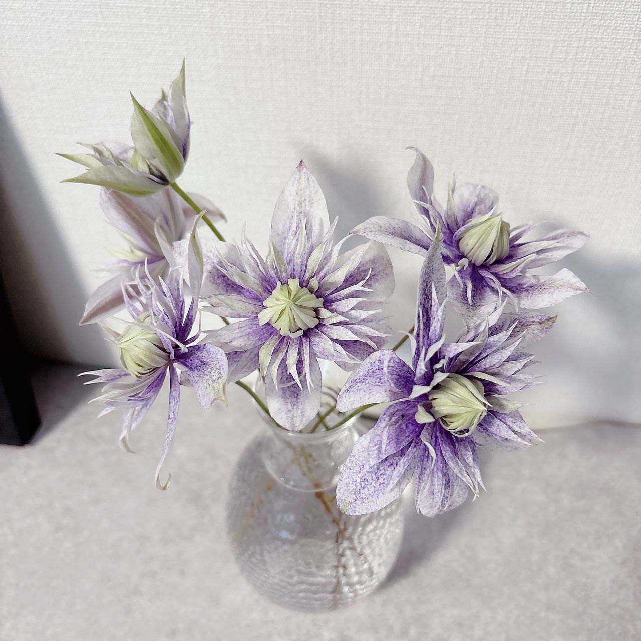 ご紹介にあった通り短めですが、お花はとても綺麗に開花してて、妖精🧚そのものな感じですね! 見てて⭐︎癒されてます😃 なかなか店舗では見ないクレマチス♡可愛い〜です。