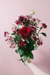 ワインレッドとホワイトのマーブルカラーのスプレーバラ「スパークリンググラフィティ」を主役に、トルコキキョウ「アンバーWバーボン」や深い赤バラを束ねてこっくり秋らしいボルドーカラーのブーケに仕上げました🍷