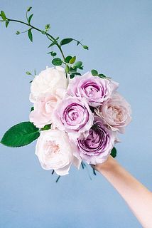 届いた箱を開けた瞬間、幸せな気持ちに!紫色、ホワイト、薄ピンクなど淡い色合いのバラを集めて。華やかなミルラの香りが魅力です。ほのかに香ります。