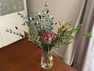 さわやかな香りがする枝物「銀香梅」を主役に🌿光沢のある葉っぱをこすると香りが広がります。