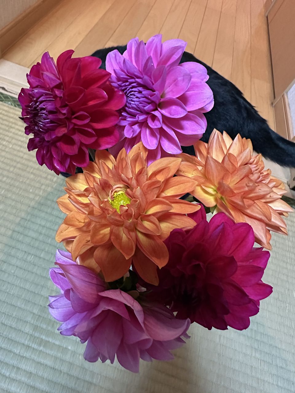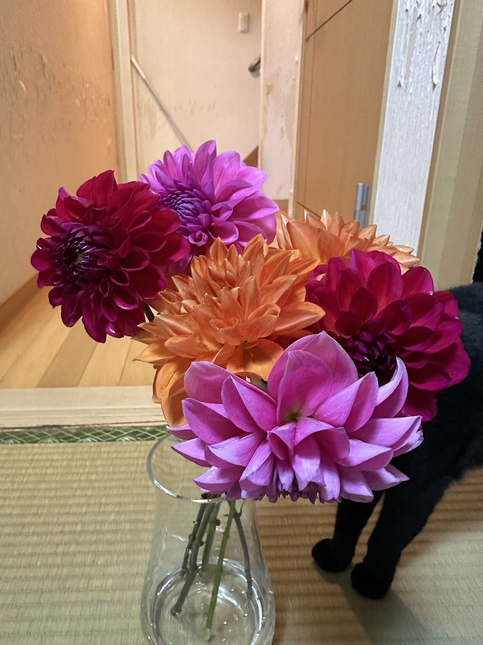 今回はダリア「エタニティロマンス」「エタニティルージュ」「オレンジストーン」などピンク・赤・オレンジのダリアを6本お届けします。エタニティシリーズは2020年から出回り始め、日持ちが大変優れている品種です!ぜひお試しを✨