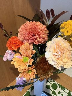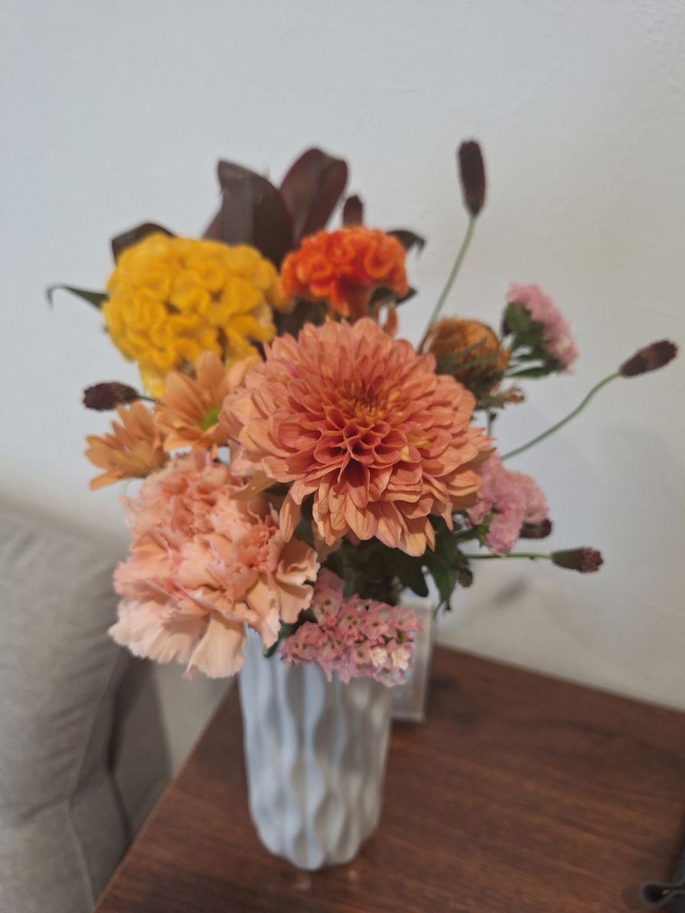 初めて買いました。自分では買わないお花もあり新鮮でした。普段はお店で買ってきたらそのまま飾るんですが今日はきちんと水揚げしました。ケイトウがとても可愛いです。オレンジばかりなのでハロウィンぽくなりました🎃🧡また今度は違うテイストのお花を買おうと思います。