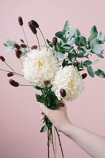 ポイントにわれもこうとユーカリを添えて。出回りの少ない品種なのでこの機会にぜひお楽しみください。