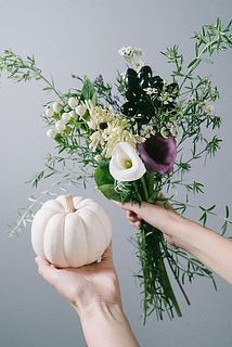 白いかぼちゃとホワイト×ブラックパープルのブーケをセットでお届け👻まっしろなカボチャは小さなおばけのよう。